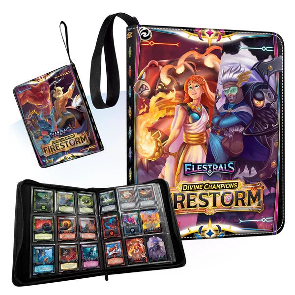 Fuel your fire and channel divine speed with the Firestorm Binder, the ultimate accessory for any Elestrals Caster looking to protect and showcase their growing collection. Featuring breathtaking full-color vinyl artwork of Hestia and Hermes, along with their Divine Champions Majursa and Carryoff, this binder embodies the fiery clash between power and precision.